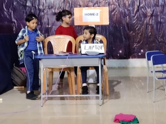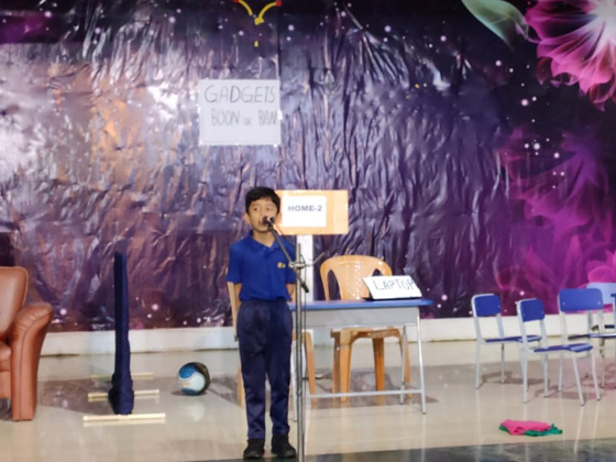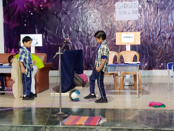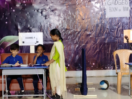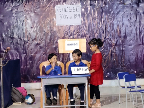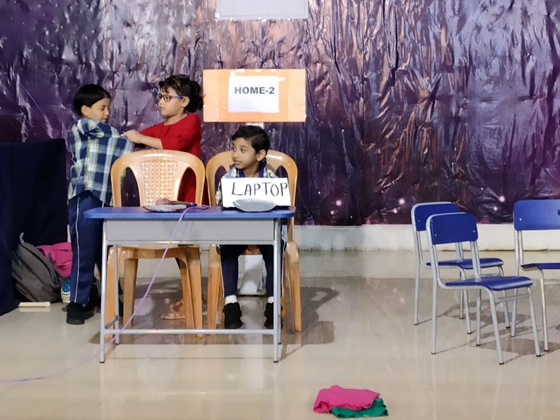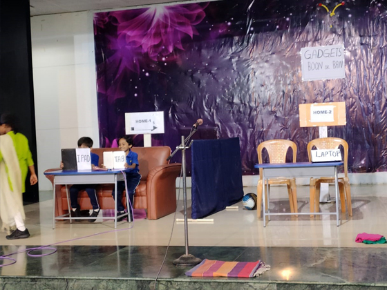 The practice for the assembly began by explaining the advantages and disadvantages to the children in using- phones, tabs, and laptop etc. and by instigating the children on outdoor games rather than the indoor /ipad games.Students enacted a skit on using and limiting ourselves in using gadgets . They also explained about the health and physiological effects.As we all know the old saying "Too much is too bad".It is we who have to limit ourselves in using technology.
