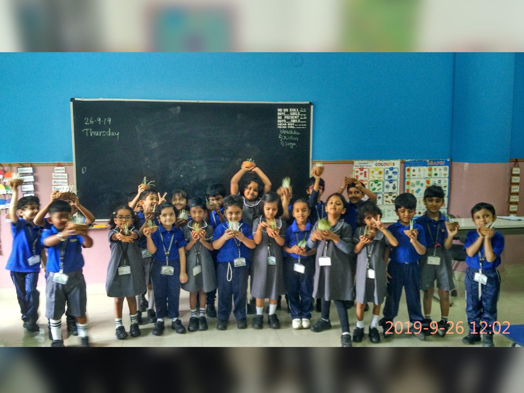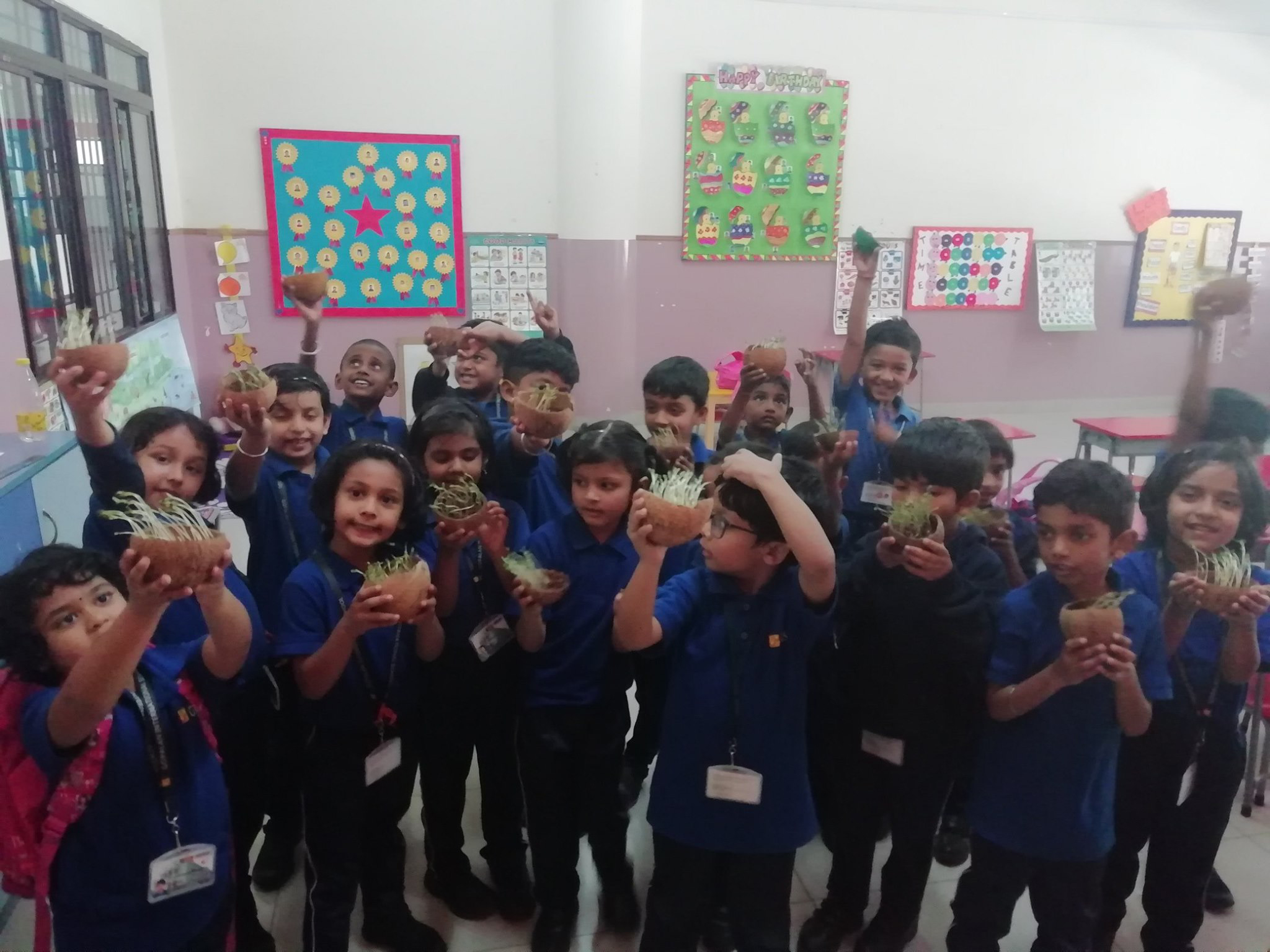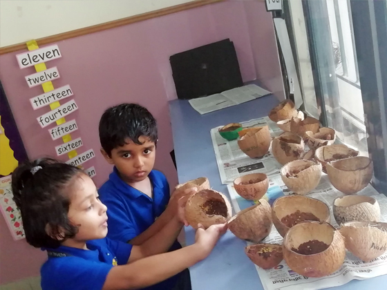 Students of Pre-primary Department had yet another exciting day. Each child brought a used coconut shell to use for germinating seeds. They were thrilled to see their seeds sprout and grow !! They also learnt the importance of soil, sunlight and water for seeds to germinate.