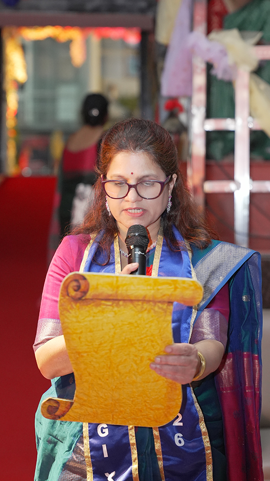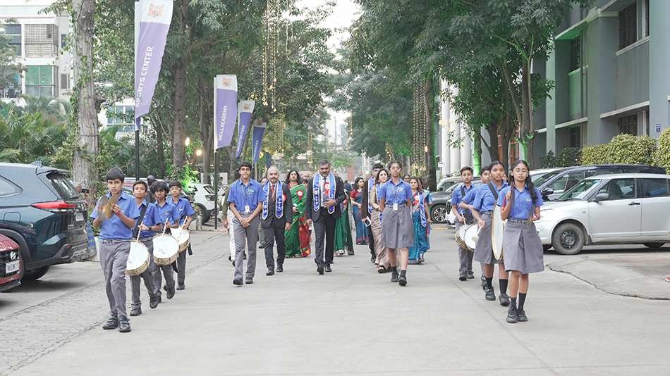 The programme commenced with the arrival of the Chief Guest, the Guest of Honour, and other distinguished dignitaries, followed by the Valedictory March, led by the Principal, the Coordinators, the Class Teachers, and the Subject Teachers, marking the ceremonial beginning of the event followed by the lighting of the ceremonial lamp, symbolising knowledge, wisdom, and enlightenment. This was followed by a melodious welcome song, setting a serene and auspicious tone for the ceremony. The Welcome Address formally greeted the gathering, after which the Chief Guest and Guest of Honour were introduced and felicitated. The Director, Madam Sunitha Prabhakar, was also felicitated in recognition of her visionary leadership and constant guidance.