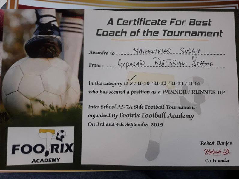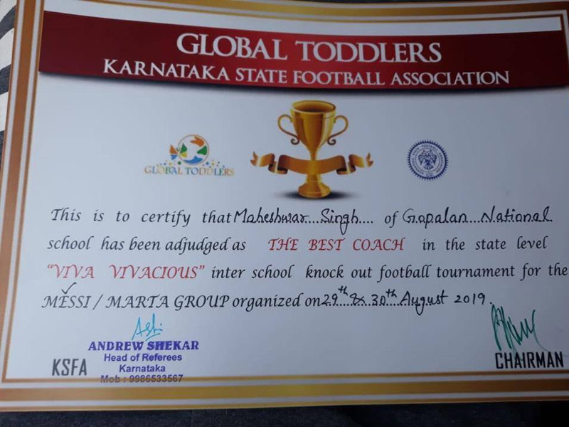 GNS football coach Mr.Mahesh has been awarded as The BEST COACH of the tournament for the pre-primary inter school football tournament held at Whitefield global school.